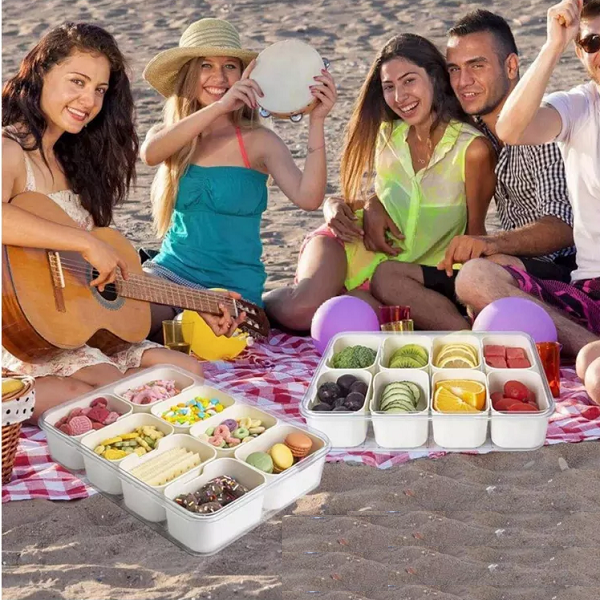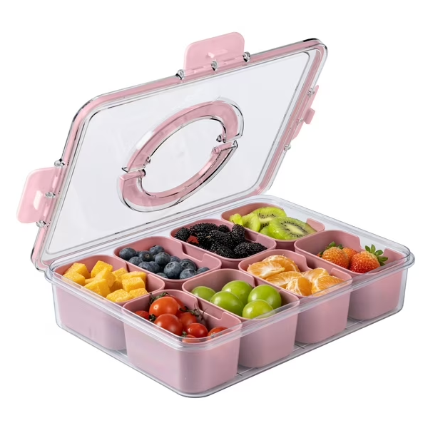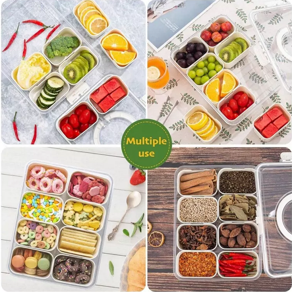 Bandeja multiuso con 8 contenedores individuales extraíbles que facilitan el lavado y el reabastecimiento. La tapa con cierre y asa evita derrames y hace más cómodo el transporte. El diseño transparente permite identificar el contenido de un vistazo y presentar los alimentos de forma limpia y atractiva. Perfecta para snacks, salsas, toppings, condimentos y especias. Aplicaciones y usos Servir frutas, frutos secos, dulces o toppings. Organizar especias, semillas y condimentos en cocina. Llevar snacks a picnics, paseos, reuniones o al trabajo. Preparación semanal (meal-prep) con porciones separadas. Estaciones de nachos, sushi, helados o desayunos.