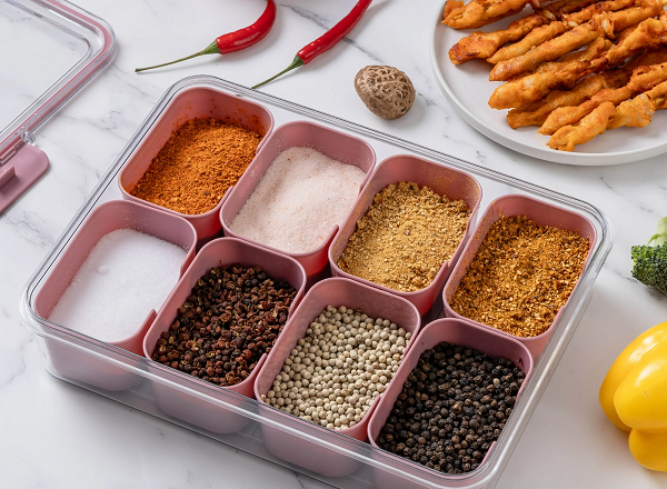 Marca / Nombre:Magic Spice Grid Modelo:Maletín contenedor con 8 recipientes. Material:Plástico rígido de uso alimentario (PP/PS). Color:Blanco / transparente. Largo:31cm. Ancho: 23.5cm. Fondo: 6.5cm. Tipo: Bandeja organizadora dividida con tapa. Compartimentos: 8 recipientes removibles. Cierre: Tapa encajable/clip con asa para transporte.