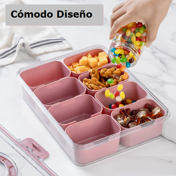 Convierte cualquier mesa en un mini-buffet con esta bandeja con 8 envases, separa snacks, frutas, frutos secos o especias sin mezclar sabores. Su tapa transparente con asa permite llevarla a picnics, la oficina o reuniones. Mantén todo ordenado, visible y listo para servir.