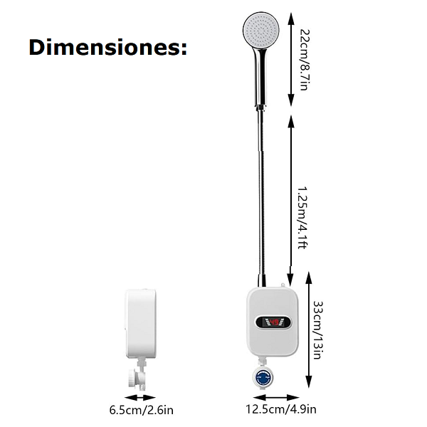 Marca / Nombre: Thermostatic Water Heater. Modelo: RX-021 Material: Acero inoxidable y ABS. Color: Blanco Alto: 33cm. Ancho: 12,50cm. Fondo: 6,5cm. Largo manguera: 125cm. Emisión de agua: con ducha de mano. Potencia: 3.500W Voltaje: 110v. / 220v. Rango de temperatura: 30°C – 60°C Pantalla: LCD digital Protección: IPX4 (resistente al agua) Peso: 1.3 kg