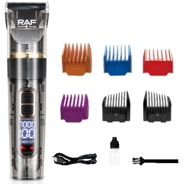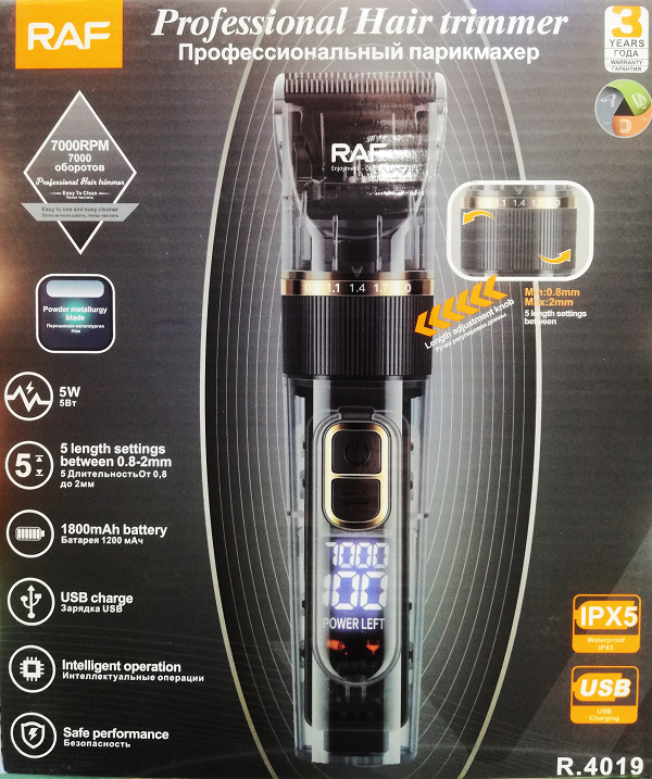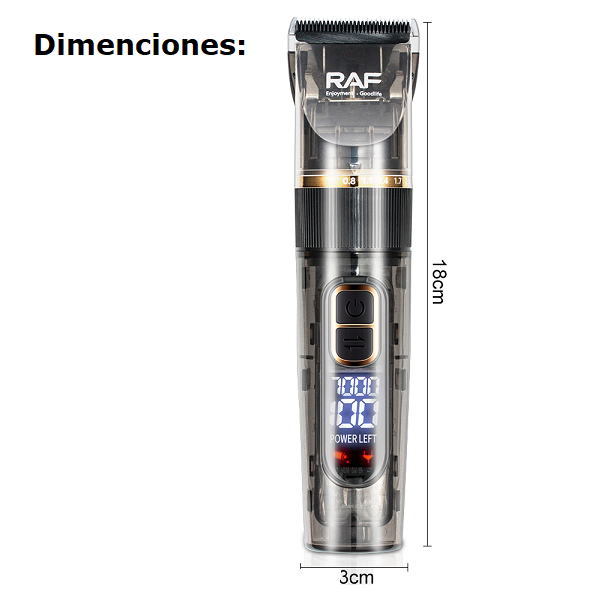 Marca / Nombre: RAF Modelo: RAF R4019 (R.4019) Material: ABS + Cuchillas metálicas. Color: Negro. Alto: 18cm. Ancho: 3cm. Potencia: 5W Batería recargable: 1800 mAh (algunos listados reportan hasta 2500 mAh). Pantalla LED/digital: muestra nivel de batería y (según ficha) velocidad. 6 niveles de corte / peine de: 3 mm, 6 mm, 9 mm, 12 mm, izquierdo y derecho. Resistencia al agua: IPX5. Carga: USB 5V. Peso: ~400 g.