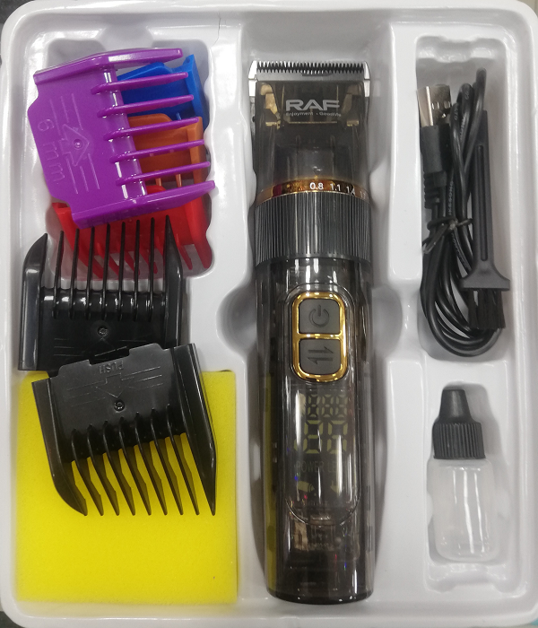 1 Cortadora RAF R4019. 6 Peines de: 3 mm, 6 mm, 9 mm, 12 mm, izquierdo y derecho. 1 Cable USB. 1 Aceite para cuchillas. 1 Cepillo de limpieza. 1 Esponja de acabado.