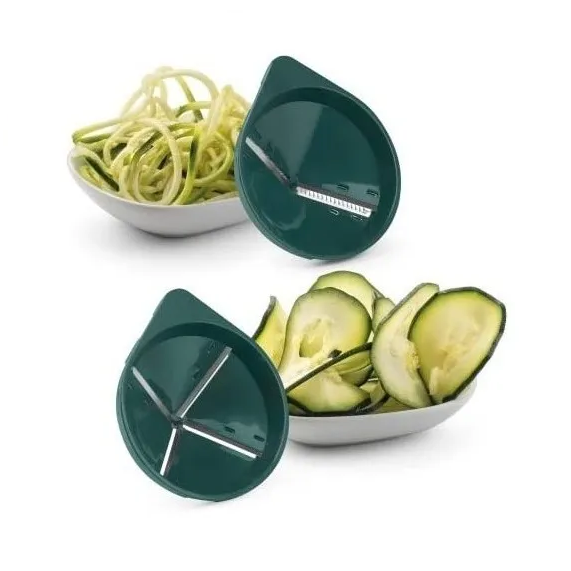 Transforma frutas o verduras en novedosas presentaciones. Incluye dos cortadores para tiras largas y otro para rebanadas delgadas.