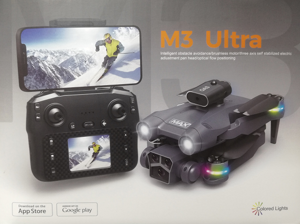 1 Drone M3 Ultra Max. 1 Batería. 1 Control remoto con pantalla integrada. 1 Estuche de almacenamiento. 4 Hélices de repuesto. 4 Protectores de hélice. 1 Cables de carga USB. 1 Destornillador. 1 Tarjeta micro sd de 512Gb. 1 x Manual de usuario.