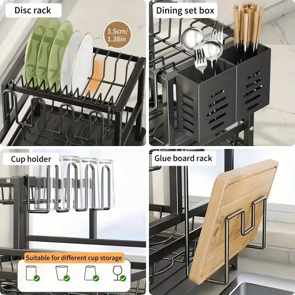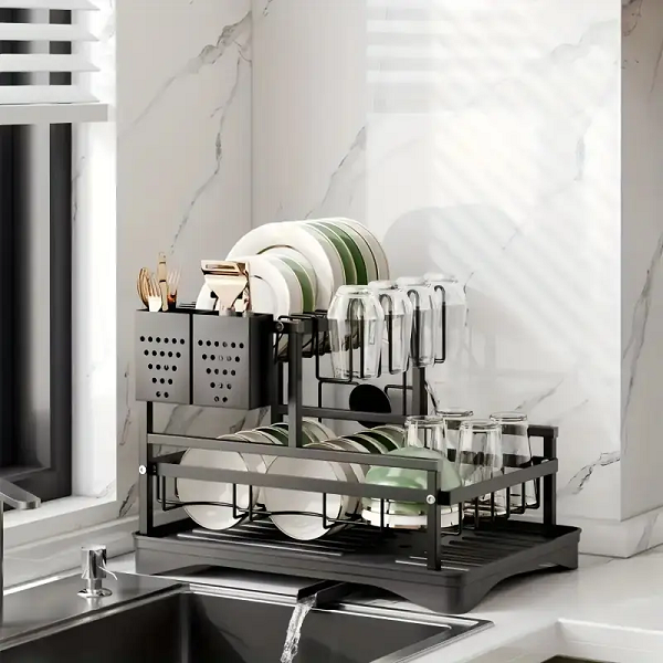 Su doble nivel permite secar platos, bowls y vasos a la vez, con soportes para tapas. La bandeja recoge–goteo con boquilla guía el agua directamente al fregadero. Estructura metálica resistente con acabado anti-óxido y patas antideslizantes. Montaje rápido y limpieza sencilla para una cocina siempre ordenada.