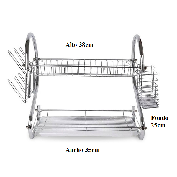 Para platos, vasos, tazas, cubiertos, ollas. De acero inoxidable cromado, muy estable. Con bandeja recogedora de agua. Un lado porta vasos y otro cubiertos.