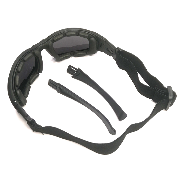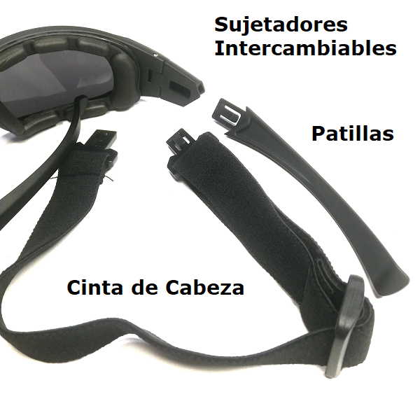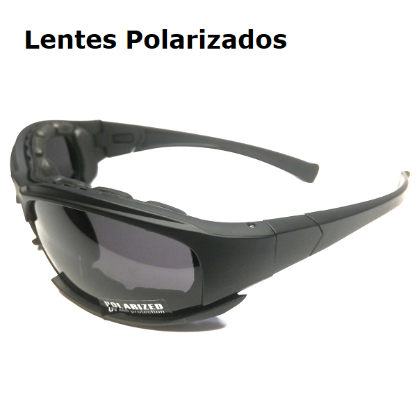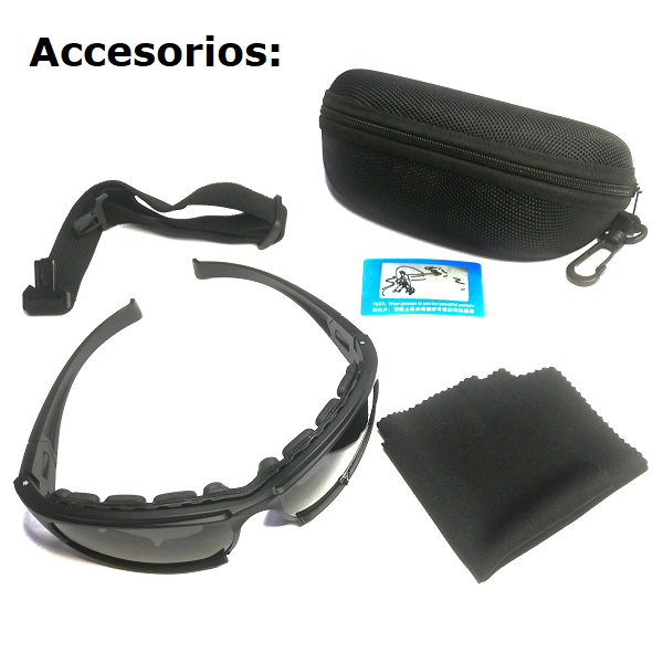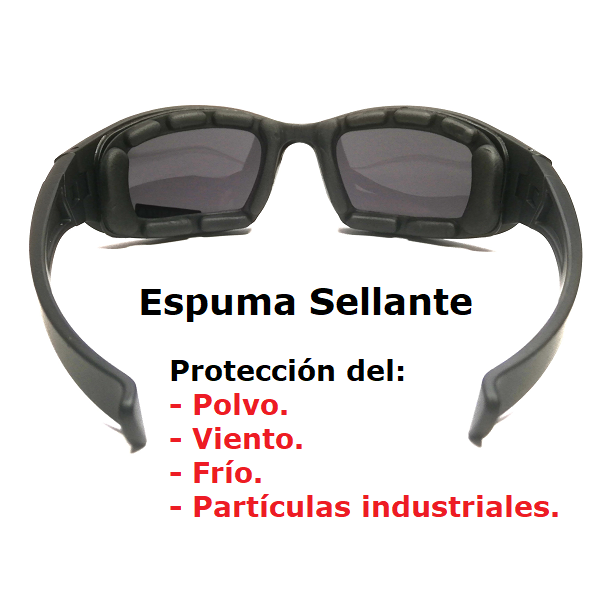 Marca / Nombre: Gafas Polarizadas con Espuma Sellante para Viento o Polvo. Modelo: Convertible (patillas intercambiables + correa) Material: Montura: plástico PC/TPR, Espuma: EVA ventilada/sellante, Lente: policarbonato. Color: Negro (lente humo/oscuro). Alto: 4.5 cm. Ancho: Aprox. 15cm. Largo: Aprox. 12cm. Lentes: polarizados. Protección; UV. Patillas removibles / correa de cabeza intercambiable. Estuche con cierre tipo zipper.