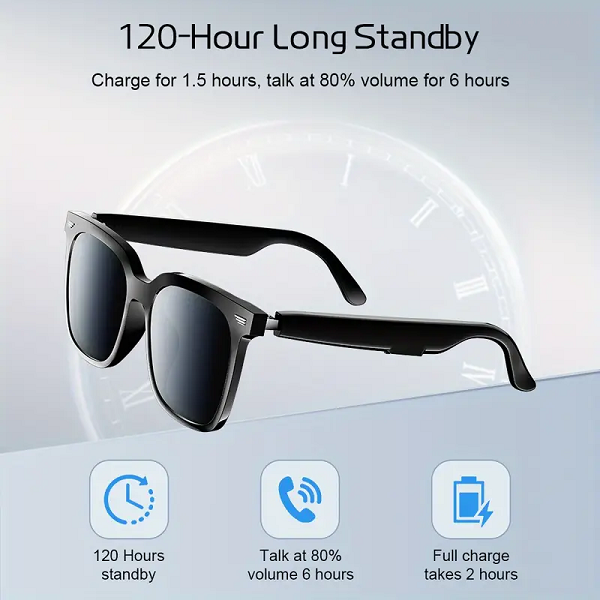 Marca / Nombre: Smart Glasses Modelo: G05. Material: ABS. Color: Negro. Largo: 14.80cm. Ancho: 14.3cm. Alto: 5.4cm. Conectividad: Bluetooth 5.0 compatible con Android e iOS Audio: Altavoces estéreo abiertos o mediante conducción ósea; micrófono integrado. Control: Panel táctil o botones en patillas; activación de asistente de voz. Autonomía: De 6 a 10 h reproducción. Tiempo de duración: En espera hasta 120 horas. Protección solar: Lentes polarizadas UV400 o protección UV. Resistencia: A salpicaduras o arañazos. Carga USB: Hasta 2 horas.