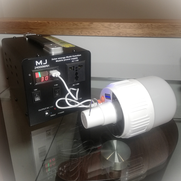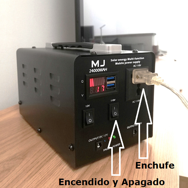 Marca / Nombre: MJ Modelo: 24.000mAh. Material: Acero inoxidable, otros varios. Color: Blanco Ancho:13cm. Alto:13cm. Fondo: 22cm. Tamaño Panel Solar: 67cm de largo x 42 cm de ancho, 2cm de fondo. Capacidad: 24.000mAh. Salida de CA 220V/110V: 1 Salida para focos: 2 Voltaje foco: 12v. Entrada dedicada: CC 12v /10ª Tiempo de carga del generador: con panel solar y buen sol de 4 a 6 horas. Tiempo aproximado de uso con 100% de carga: con una computadora, carga de celular, una lampara, conexión al Wireless, unas 10 horas, este tiempo puede aumentar si mantiene conectado el panel solar. Datos del panel solar: Capacidad: 50W(Isc): 3.62A Voltaje a potencia máxima: (Vmp) 14.0v. Corriente a potencia máxima (Imp): 3.45A Voltaje de circuito abierto (Voc):16.6V Voltaje de circuito corto (Isc): 3.62ª Aplicación: Clase A. STC=1000W/m2, 25 C AM1.5 Salidas USB: 2 de 5v /2.4A. Largo del cable del panel: 4,85cm.