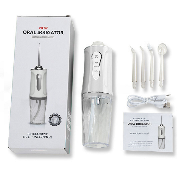 Marca:Oral Irrigator ModeloSecond Generation Material:PC Color:Blanco, rosado o verde, según stock. Ancho:6cm. Alto:19cm Voltaje normal:5v. Poetencia nominal:4W. Carga:USB Capacidad de tanque:230ml. Modos de chorro:Suave, normal, de pulso. Boquillas de chorro:1 normal, 1 sensitiva, 1 ortodóntica y 1 de lengua. Batería:De litio de 1500mAh. Carga total:En 8 horas.