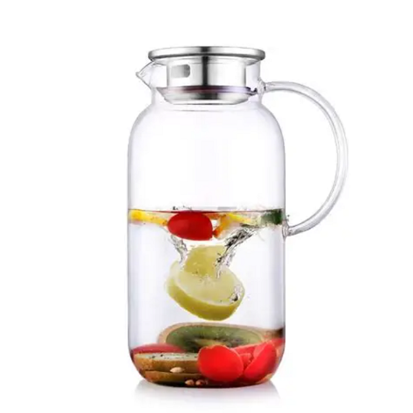 Esta jarra está fabricada en vidrio borosilicato, un material ligero, resistente y libre de BPA que soporta temperaturas extremas, desde alrededor de –20 °C hasta 150 °C (–4 °F a 302 °F) . Cuenta con un diseño funcional: asa cómoda para un vertido facilitado, tapa protectora (de metal) y pico antigoteo o filtro integrado Aplicaciones y Usos Perfecta para servir agua, jugos, té helado, café frío, sangría, licuados o bebidas frutadas. Apta para bebidas calientes o frías gracias a su resistencia térmica. Ideal en el hogar, oficinas, cafeterías, restaurantes o eventos como fiestas.
