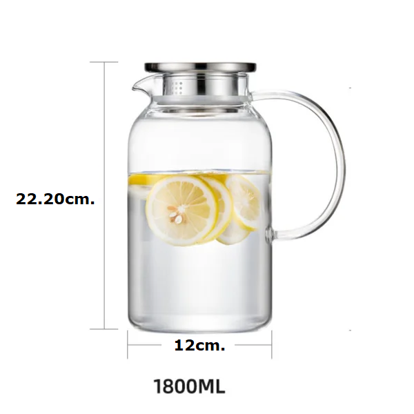 Marca / Nombre:Jarra de Vidrio de 1.8Lt. Modelo:Jarra con tapa. Material:Vidrio borosilicato libre de BPA y acero inoxidable. Color:Transparente, tapa plateada. Alto:22.20cm. Ancho: 12cm. Capacidad: aprox. 1.8 L (60 oz). Rango térmico estimado: ~–20 °C a 150 °C (–4 °F a 302 °F). Limpieza: apta para lavavajillas, aunque se recomienda lavado a mano para prolongar vida útil. Tapa: de acero inoxidable, silicona o metal con cierre antigoteo; algunos modelos incluyen filtro integrado.