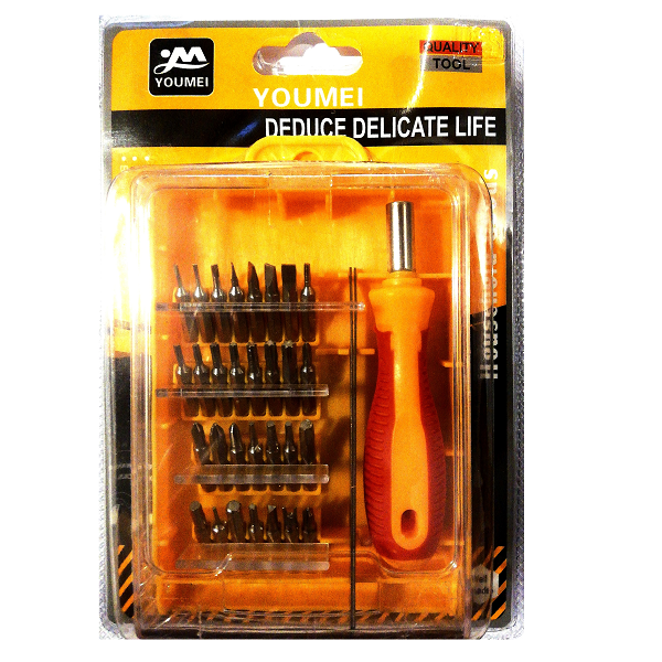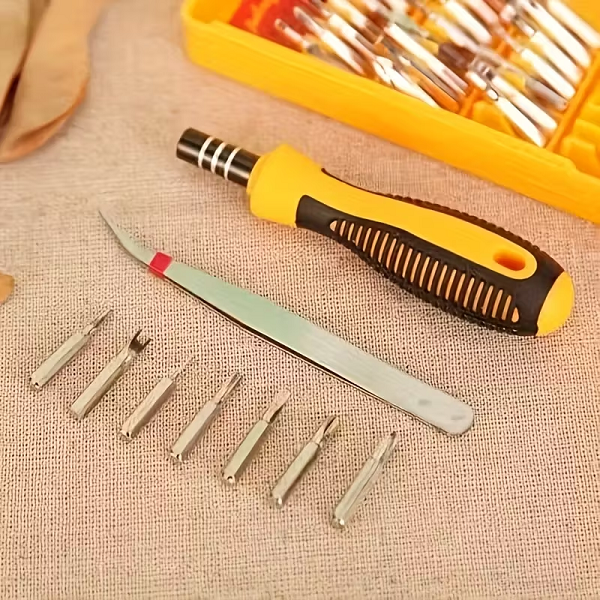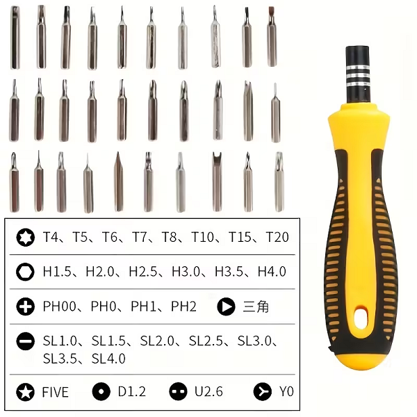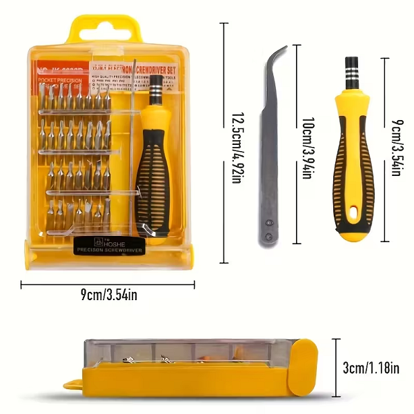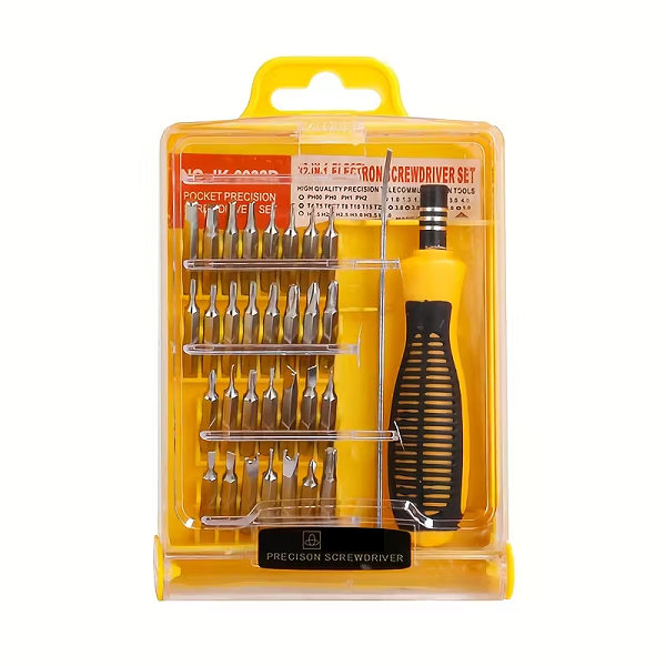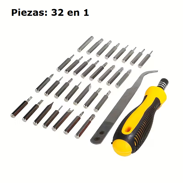 Marca / Nombre:Juego de destornilladores de precisión. Modelo: 32 piezas. Material de puntas: acero endurecido para alta durabilidad Color: Estuche amarillo y piezas plateadas. Largo:12.5cm. Ancho: 8.7cm. Fondo: 2.8cm. Formato: 32 piezas (30 puntas + 1 mango + 1 extensión rígida). Tipos de puntas: Phillips, planas, Torx, Hex/Allen, Pentalobe*, Tri-point*, U*. Imantación: sí, en portapuntas y puntas para mejor sujeción. Mango: ABS + TPR antideslizante, cuello metálico. Estuche: plástico rígido con organizador interno. Uso: precisión/electrónica y tareas ligeras.