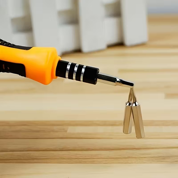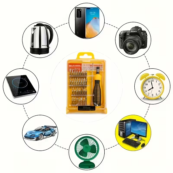 El Juego de Destornilladores de Precisión 32 en 1 reúne las puntas más usadas para dispositivos electrónicos y trabajos finos. Su mango ergonómico con agarre antideslizante reduce la fatiga, mientras que la varilla extensora y el porta puntas magnético facilitan llegar a tornillos pequeños y profundos. Todo se organiza en un estuche compacto para llevar en la mochila o el maletín de herramientas. Aplicaciones y usos Reparación de celulares, tablets y laptops. Mantenimiento de consolas, controles y PC. Ajustes de gafas, relojes y cámaras. Ensamble de pequeños electrodomésticos, juguetes, drones y modelismo. Trabajos delicados en placas electrónicas y microcomponentes.