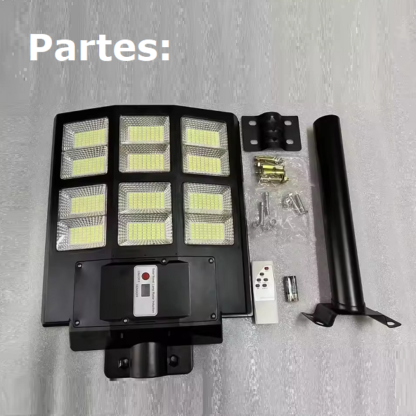 1 lámpara solar LED de 400W. 1 Control remoto inalámbrico. 1 Tubo sujetador de pared. 1 Kit de instalación (tornillos y soporte). 1 Manual de usuario.