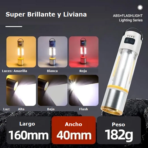 La Linterna de Camping Multifuncional YES-666 es una solución versátil de iluminación LED pensada para exterior y uso doméstico. Puede colgarse dentro de la carpa, fijarse a superficies metálicas gracias a su imán de base, o usarse como linterna de mano. Incorpora batería recargable por USB-C que entrega brillo estable y autonomía suficiente para actividades nocturnas. Su triple modo de luz (blanco para máxima visibilidad, amarillo más cálido para confort visual y rojo para señalización) la vuelve útil tanto para ocio como para emergencias. Fuentes: brillo 1.000 lm, 3 modos, imán y gancho, batería 2000 mAh y carga USB-C Aplicaciones y usos: Camping, hiking, pesca y paseos nocturnos. Cortes de luz en el hogar y kits de emergencia. Mantenimiento y reparación de autos (base magnética para trabajar manos libres). Talleres, bodegas y patios. Señalización y seguridad (modo rojo).