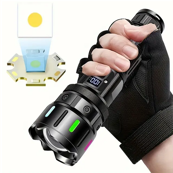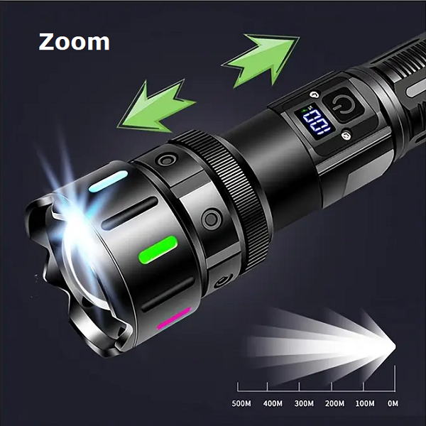 Haz más con menos luz: la Linterna Súper Fuerte 5239-1 combina zoom telescópico para enfocar o ampliar el haz, pantalla digital que muestra el porcentaje de batería y base con imán para dejarla fija mientras trabajas. Es recargable y puede dar salida USB para emergencias. Ligera y resistente para casa, auto o camping. Lista para todo: tareas, cortes de luz y aventuras nocturnas.