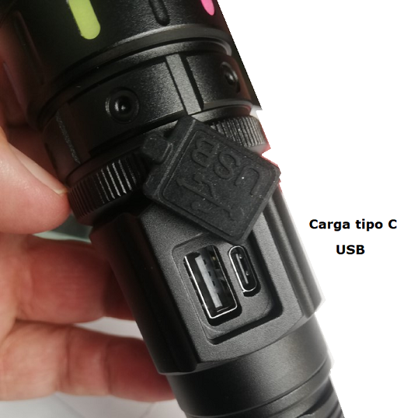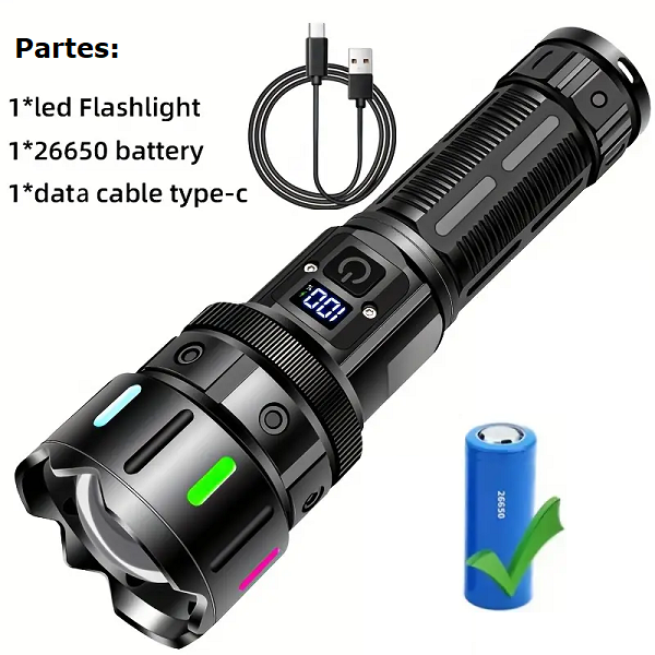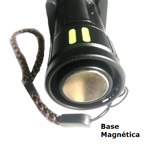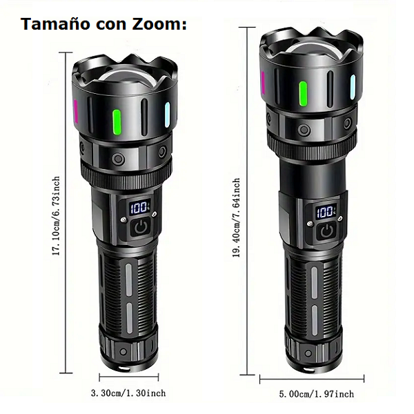Marca / Nombre: Super Strong Modelo: 5239-1 Material: Aluminio aeronáutico Color:Negro Largo:15.8cm. Ancho: 3.9cm. Fuente de luz: LED M60 (zoom telescópico). Modos: luz alta, media, baja, flash, SOS. Pantalla: digital de porcentaje de batería. Imán: base magnética. Batería: integrada tipo 18650 (≈800 mAh). Carga: USB-C. Salida USB: (power bank 5v). Impermeabilidad: IPX6.