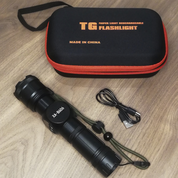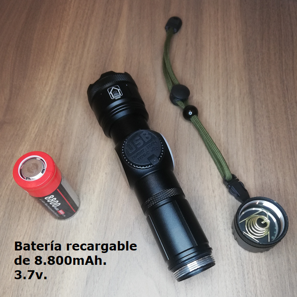 1 Linterna XA-B606. 1 Batería recargable de litio 8.800 mAh /3.7V. 1 Cable de carga USB. 1 Correa de mano. 1 Bolso sintético.