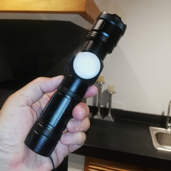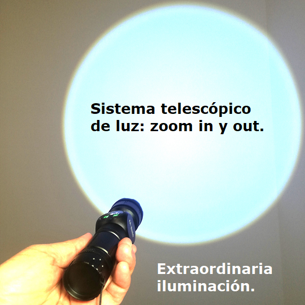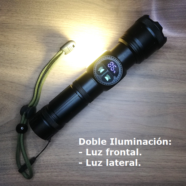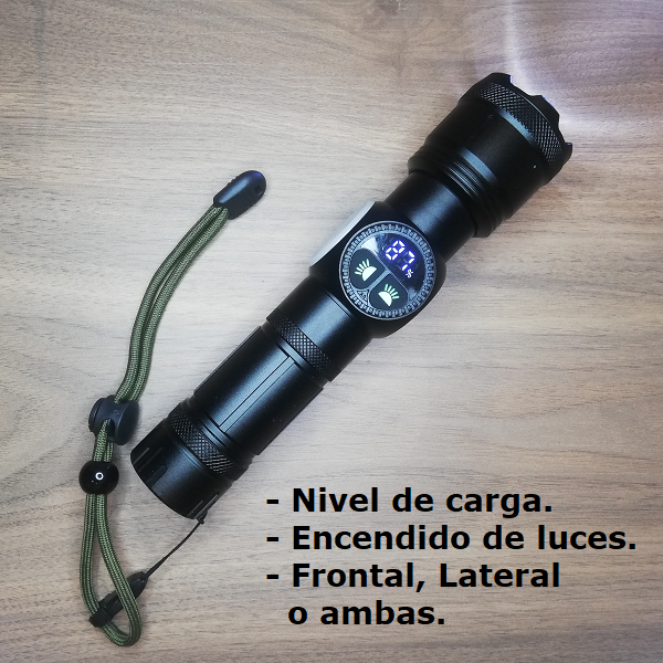 Marca / Nombre: TG Super Light Rechargeable Flash Light. Modelo: XA-B606 Material: Aluminio aeronáutico Color: Negro Largo extendible: de 17 a 18.7cm. Ancho: 4.3cm. Luz frontal: LED de alta potencia. Luz lateral: COB de iluminación amplia. Pantalla digital: Indicador de porcentaje de batería. Tipo de carga: USB Tipo-C. Batería: Recargable de litio 26650 / 3.7V. / 8.800mAh. Potencia luminosa máxima: 20 veces más potente que linternas normales. Modos de iluminación frontal: Alto / Medio / Bajo / Estrobo / SOS. Modos de iluminación lateral: Alto / Medio / Rojo / Rojo Estrobo. Modo: de las dos luces a la vez. Zoom: Ajustable telescópico. Alcance aproximado: hasta 800m. Autonomía: hasta 14 horas dependiendo del modo. Resistencia: a la lluvia, impermeabilidad IPX7. Empuñadura: antideslizante. Correa de seguridad para transporte. Bolsa de carga con correa y cierre.