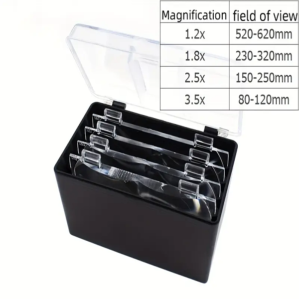 1 Cinta de cabeza porta lupas 4 Lupas con diferentes medidas. 1 Manual.