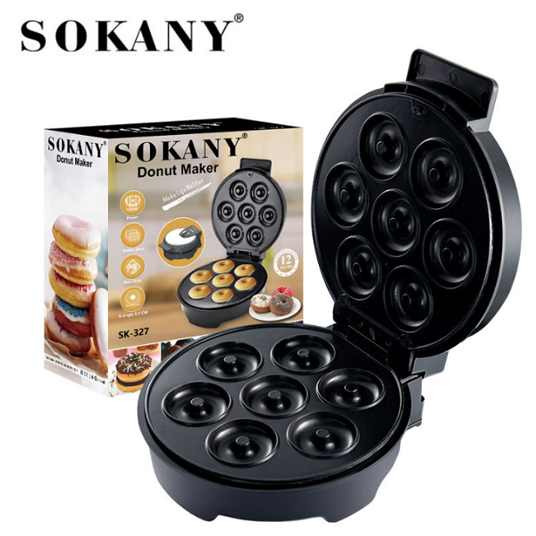 Marca / Nombre: Donut Maker Modelo: SK-327 Material: ABS y acero inoxidable Color:Negro Largo:25cm. Ancho: 21,2cm. Alto:10cm. Potencia: 1.200W Capacidad: 7 donuts pequeños por sesión. Placa de hornear: con recubrimiento antiadherente para facilitar la limpieza. Control automático: de temperatura. Almacenamiento: vertical para ahorrar espacio.