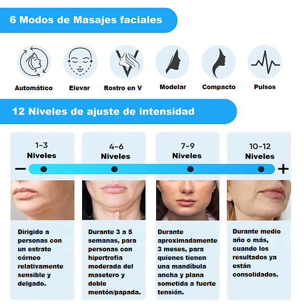 Este Masajeador está diseñado para quienes desean definir el óvalo facial sin tratamientos invasivos. Su forma en “V” se adapta a la línea de la mandíbula, aplicando suaves vibraciones y calor localizado que ayudan a relajar la musculatura y mejorar la apariencia de la piel. Solo debes colocarlo bajo el mentón, ajustar la intensidad y disfrutar de una sesión de cuidado personal en casa.