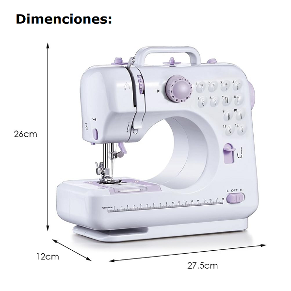 Marca / Nombre: Hosehold Sewing Machine. Modelo: SM-505A Material: ABS Color:Blanco Alto:26cm. Ancho: 27.50cm. Fondo: 12cm. Puntadas: 12 patrones integrados con dial selector. Velocidades: 2 (L/H) con interruptor frontal. Avance/Retroceso: botón de reversa para remates. Luz de trabajo: LED integrado. Operación: pedal o interruptor (mano). Alimentación: 110v. DC 6 V ~1200 mA (adaptador) o 4×AA (no incluidas). Peso aprox.: 5.5 lb (2.5 kg).