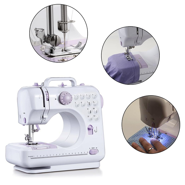 Es una mini máquina confiable para principiantes y uso doméstico. Selecciona entre 12 puntadas para dobladillos, bajos, zigzag y más. Trabaja con luz LED integrada y cose en avance o retroceso para rematar. Úsala con pedal o con el interruptor frontal, y aliméntala por adaptador o 4×AA.