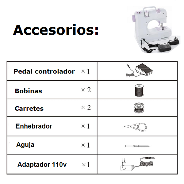 1 Mini Máquina de coser SM-505A. 1 Pedal controlador. 2 Bobinas. 2 Carretes de hilo. 1 Enhebrador. 1 Aguja. 1 Manual de usuario.