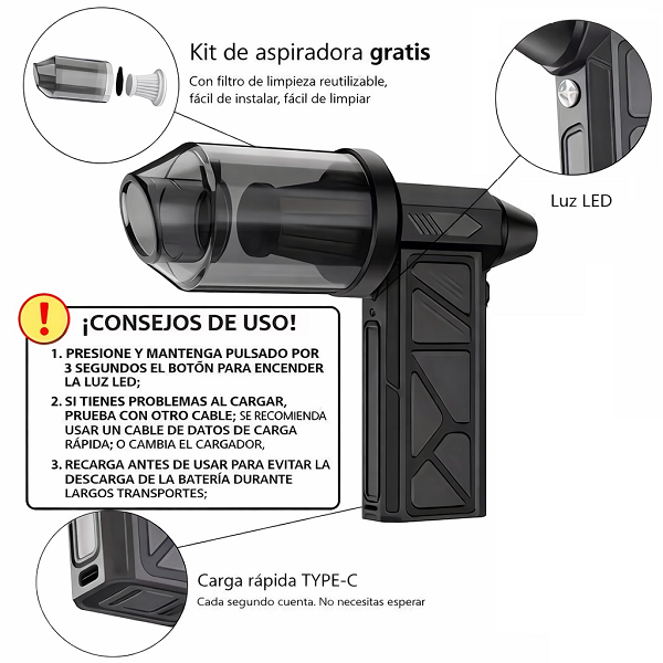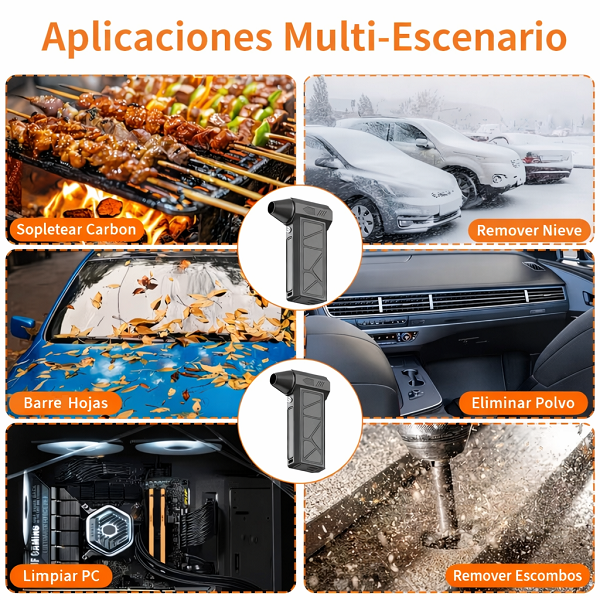 El Mini Turbo Ventilador y Aspiradora 2 en 1 es un dispositivo multifuncional diseñado para ofrecer limpieza y ventilación en un formato compacto y potente. Gracias a su tecnología de alta velocidad, puede eliminar polvo, suciedad y residuos en segundos, además de funcionar como ventilador portátil para refrescarte en cualquier lugar. Aplicaciones y Usos: Limpieza de teclados, laptops y equipos electrónicos. Eliminación de polvo en autos, escritorios y espacios reducidos. Inflado rápido o soplado de superficies. Ventilador portátil para uso personal en días calurosos. Ideal para camping, oficina, hogar o viajes. Fantástico para encender fogatas o carbón.