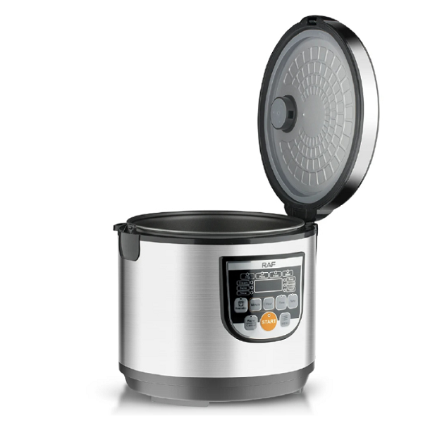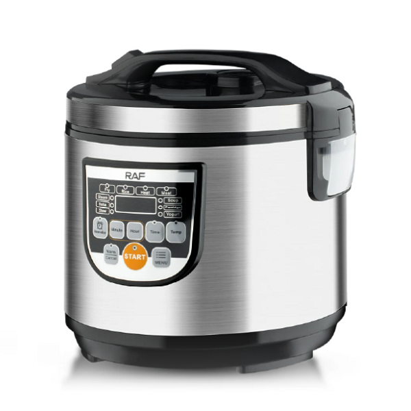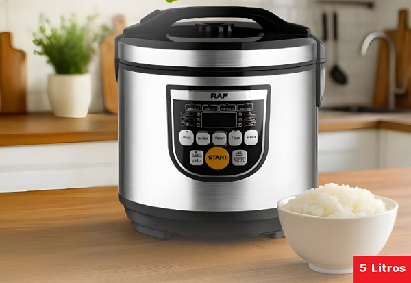 Este modelo de RAF es una olla multifuncional digital con pantalla LED y menú de funciones automáticas, ideal para preparar una gran variedad de recetas. Permite programar la cocción con hasta 24 horas de anticipación y mantener los alimentos calientes gracias a su control de temperatura constante. Su interior cuenta con recubrimiento antiadherente, lo que facilita la limpieza y asegura una cocción uniforme. Funciones programables: Freír, Cocinar al vapor, Hornear, Guisar/Estofar, Arroz, Calentar, Carne, Sopa, Papilla/Avena cocida, Yogur. Aplicaciones y usos Cocinar arroz al punto exacto. Preparar sopas, guisos, carnes y vegetales al vapor. Elaborar yogurt y papillas. Hornear (función Bake) y freír alimentos. Mantener caliente la comida lista para servir.