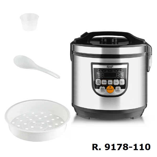 Marca / Nombre: RAF Modelo: R. 9178-110 Material: ABS exterior e interior con recubrimiento antiadherente. Color: Negro Alto: 24cm. Ancho: 24cm. Capacidad 5.0 litros Potencia 700 W Control: Panel digital con pantalla LED. Temporizador: hasta 24h. Funciones: Freír, Cocinar al vapor, Hornear, Guisar/Estofar, Arroz, Calentar, Carne, Sopa, Papilla/Avena cocida, Yogur. Función extra: Mantener calor automático / Cancelar.