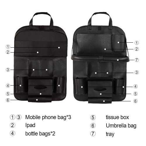 Marca:Folding Dinner Posture Back Hanging Bags Modelo:Para siento posterior de vehículo. Material:Cuero Color:Negro Alto:58cm. Ancho:48cm. Fondo:0,5cm. Lugar de instalación:Parte posterior de asientos. Espacios: 2 Porta vasos 1 Porta caja de Tissue 2 Bolsillos para celulares 1 Porta paraguas 1 Porta documentos, tablet o laptop.