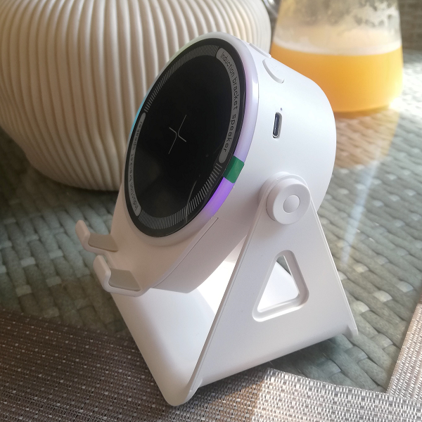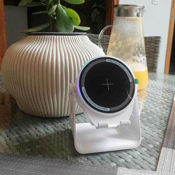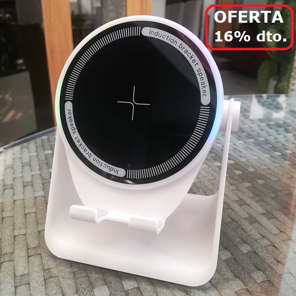 Marca / Nombre: Wireless Induction Bluetooth Speaker Modelo: ZJ-08 Material: ABS resistente Color: Blanco y Negro Alto: 13 cm Ancho: 10 cm Fondo: 8.8 cm Tecnología: de inducción magnética inteligente. Bluetooth: versión 5.3. Alcance: 10 metros. Sonido: envolvente 9D. Conexión automática: en 0.1 segundos. Sistema: de graves reforzado. Batería: 1200 mAh. recargable de larga duración. Compatible: con múltiples dispositivos. Diseño: giratorio ajustable hacia arriba y abajo. Puerto de carga: USB 5V-1A. Tiempo de carga: 3 horas. Tiempo de uso de 5 a 8 horas dependiendo del volumen.