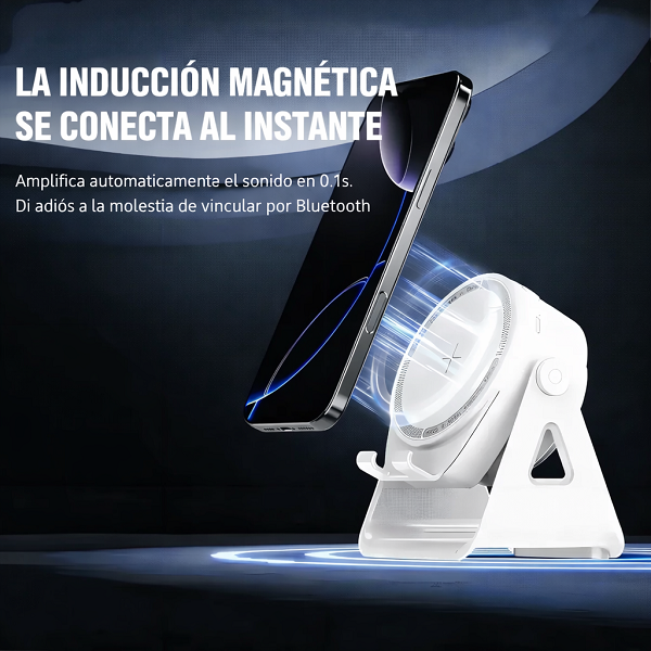 Descubre la nueva forma de amplificar el sonido de tu celular al instante. Gracias a su tecnología de inducción magnética, se conecta automáticamente en segundos. Disfruta de un audio potente con graves mejorados y sin distorsión. Su diseño moderno funciona como soporte estable y elegante para tu escritorio. Un gadget innovador que combina practicidad, tecnología y estilo.