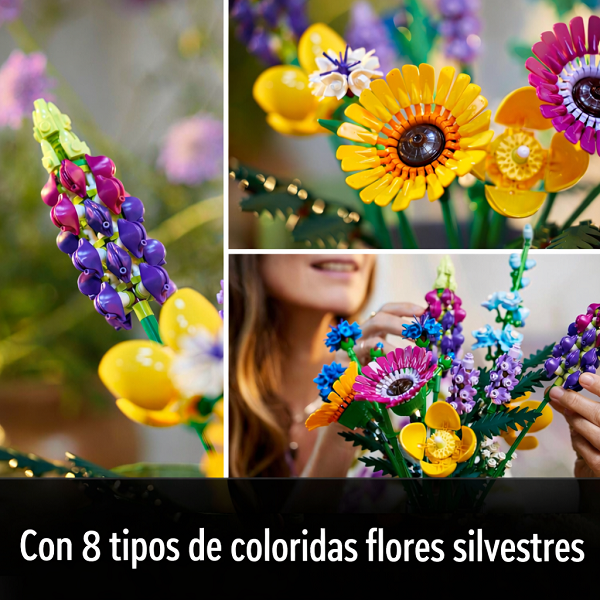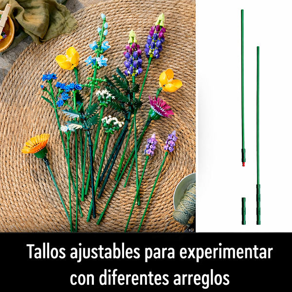 Marca / Nombre: Wild Flower Bloom Modelo: No.FH-1 Material: Plástico ABS resistente Color: Multicolor Alto: 43 cm. Piezas: 939 Set armable: tipo bouquet floral. Diseño detallado con múltiples tipos de flores silvestres. Tallos ajustables y combinables. No requiere mantenimiento. Uso decorativo.