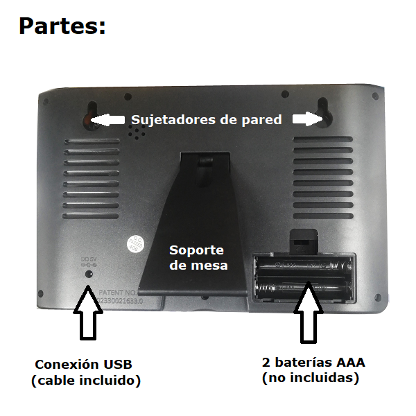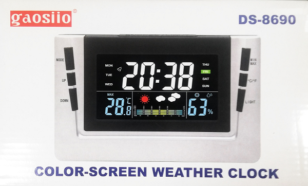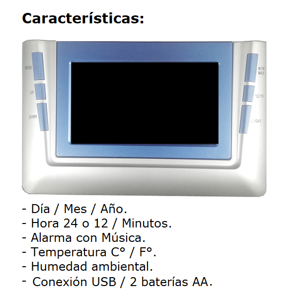 Marca / Nombre: Gaosiio Modelo: DS-8690 Material: ABS Color: Blanco con azul. Ancho:19cm. Alto: 12cm. Fondo: 2.6cm. Pantalla: Led a color. Conexión: USB 5v / 2 baterías AA de respaldo. Alarma: con música. Fecha: día / mes / año. Tiempo: hora 12 o 24 / minutos. Termómetro: en C° o F°. Humedad: ambiental.