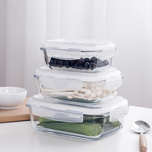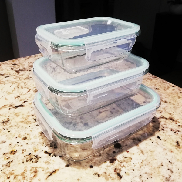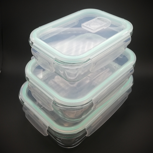 3 Recipientes de Vidrio Rectangulares. 3 Tapas herméticas con clip y válvula de desfogue.