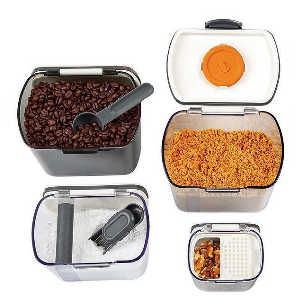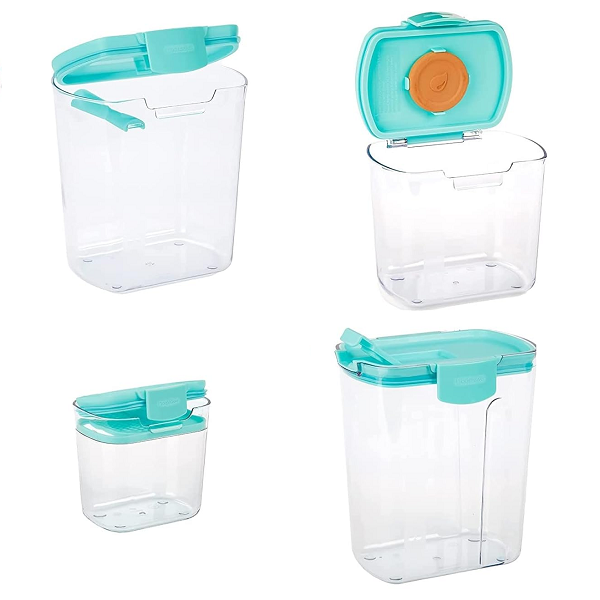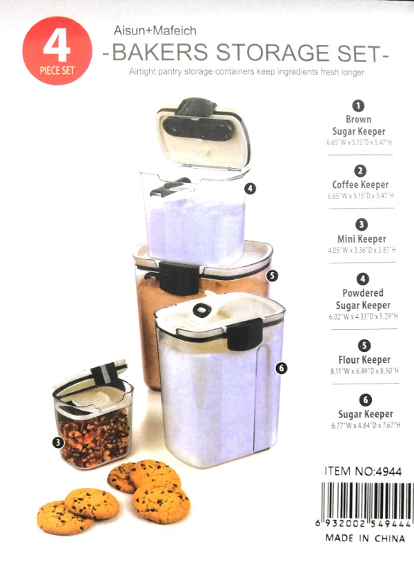 Marca / Nombre: 4 Bakers Storage Set Modelo: 4944 Material: Plástico apto para alimentos, libre de BPA; junta de silicona. Color: Transparente. Tamaño 1: Anc 20.60 × Fon 16.48 × Alt 21.59 cm. Tamaño 2: Anc 17.20 × Fon 12.29 × Alt19.48 cm. Tamaño 3: Anc 15.29 × Fon 11.00 × Alt 13.44 cm. Tamaño 4: Anc 10.29 × Fon 8.53 × Alt 9.68 cm. Cantidad de contenedores: 4 recipientes. Cierre: pestillo frontal de presión. Formato: cuerpo transparente, esquinas redondeadas, apilables. Limpieza: aptos para lavavajillas (rejilla superior).