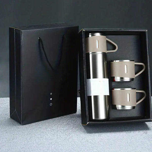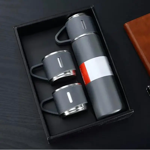 Set compacto y elegante compuesto por un termo de vacío y tres tazas. El interior de acero inoxidable apto para alimentos y el aislamiento de doble pared ayudan a mantener la temperatura y el sabor. La tapa funciona como una tercera taza y sella de forma segura para transporte sin derrames. Acabado exterior mate anti-huellas, tazas con aro metálico y asas ergonómicas para un agarre cómodo. Presentación en caja y funda de regalo lista para personalizar con marca o dedicatoria. Aplicaciones y usos Regalos corporativos, ferias y kits de bienvenida. Oficina, universidad y viajes diarios. Camping, picnics, carretera y playa. Hogar: desayunos, café de la tarde o infusiones. Actividades al aire libre donde se comparte bebida caliente o fría.