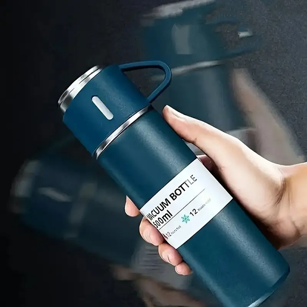 Marca / Nombre: Vacuum Flask Set Modelo: Termo con 3 Tazas de Acero Inoxidable Material: Acero inoxidable interior de grado alimenticio + PP libre de BPA en tapa y asas. Color: Azul, negro, plomo, blanco, según stock. Tamaño termo: Alto 24cm. / 6.5cm. Tamaño taza: Alto 6cm. / 6.5cm. Cantidad de tazas: 3 Aislamiento: doble pared al vacío. Capacidad del termo: ~500 ml. Capacidad de cada taza: ~180ml. Rendimiento térmico: caliente hasta ~8 h y frío hasta ~12 h. Cierre: tapa roscada hermética que también sirve de taza. Acabado: pintura mate/antideslizante (colores disponibles según stock). Presentación: caja y funda de regalo.