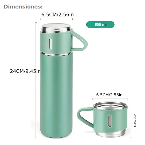 1 termo de vacío. 2 tazas con asa. 1 tapa-vaso (tercera taza). 1 caja con funda de regalo.